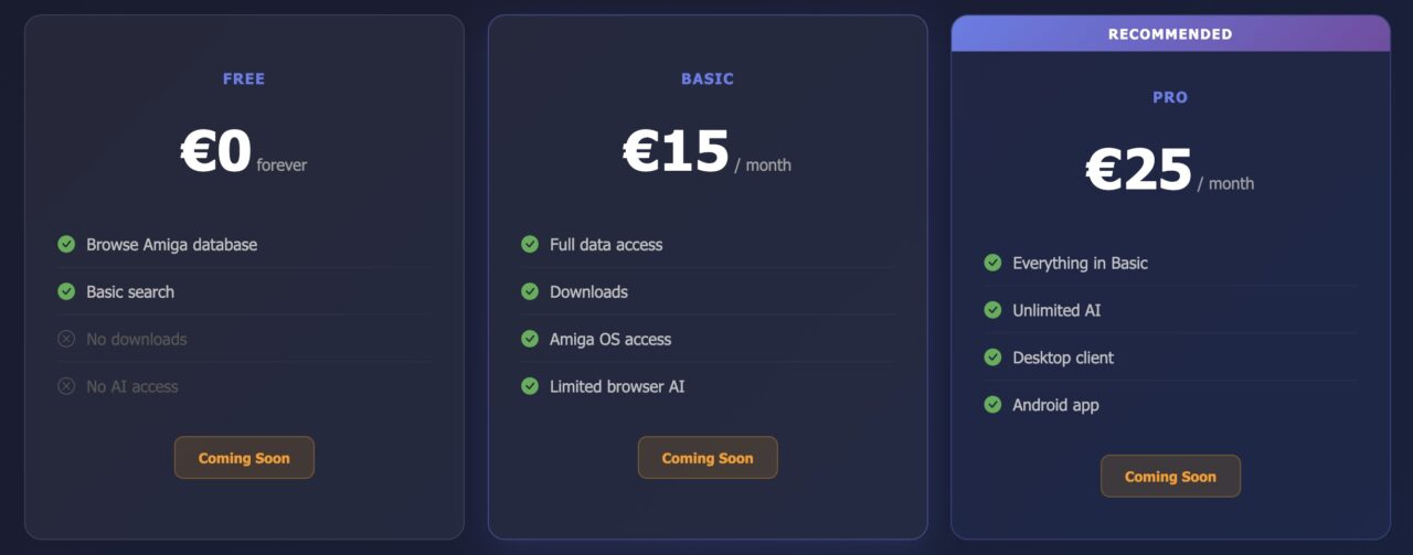 Amigo AI is expected to become available in early April 2026. It will be a handy companion for sure. For 15 euros per month it is planned to have AmigaOS accesss. A Desktop client and Unlimited AI for 25 Euros per month as pro. But the FREE version will also let it browse it’s Amiga database.
