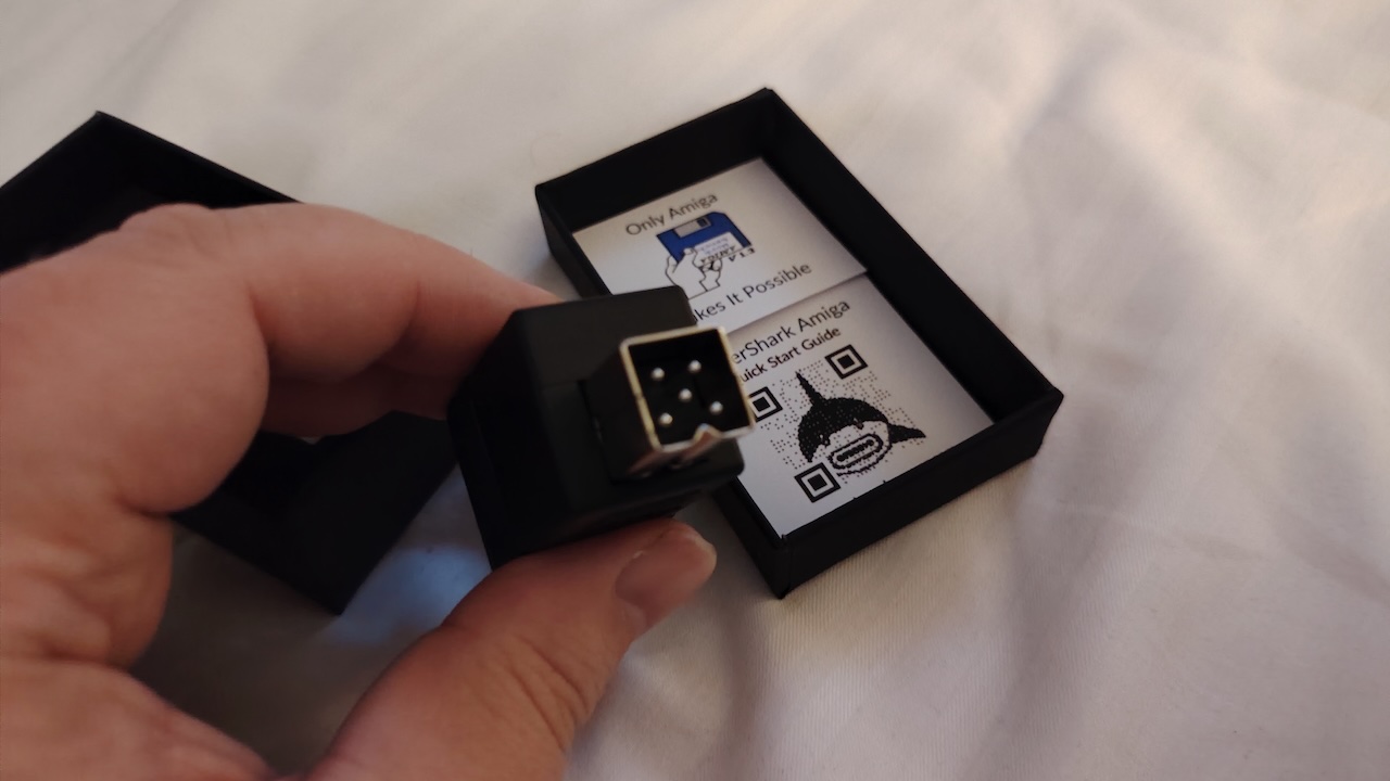 The physical setup of the Powershark is laughably simple, taking less than five seconds. It’s a literal plug-and-play modernization. You simply insert the Powershark’s square DIN connector into the back of your Amiga (A500, A600, or A1200) and connect a USB-C cable. That’s it.